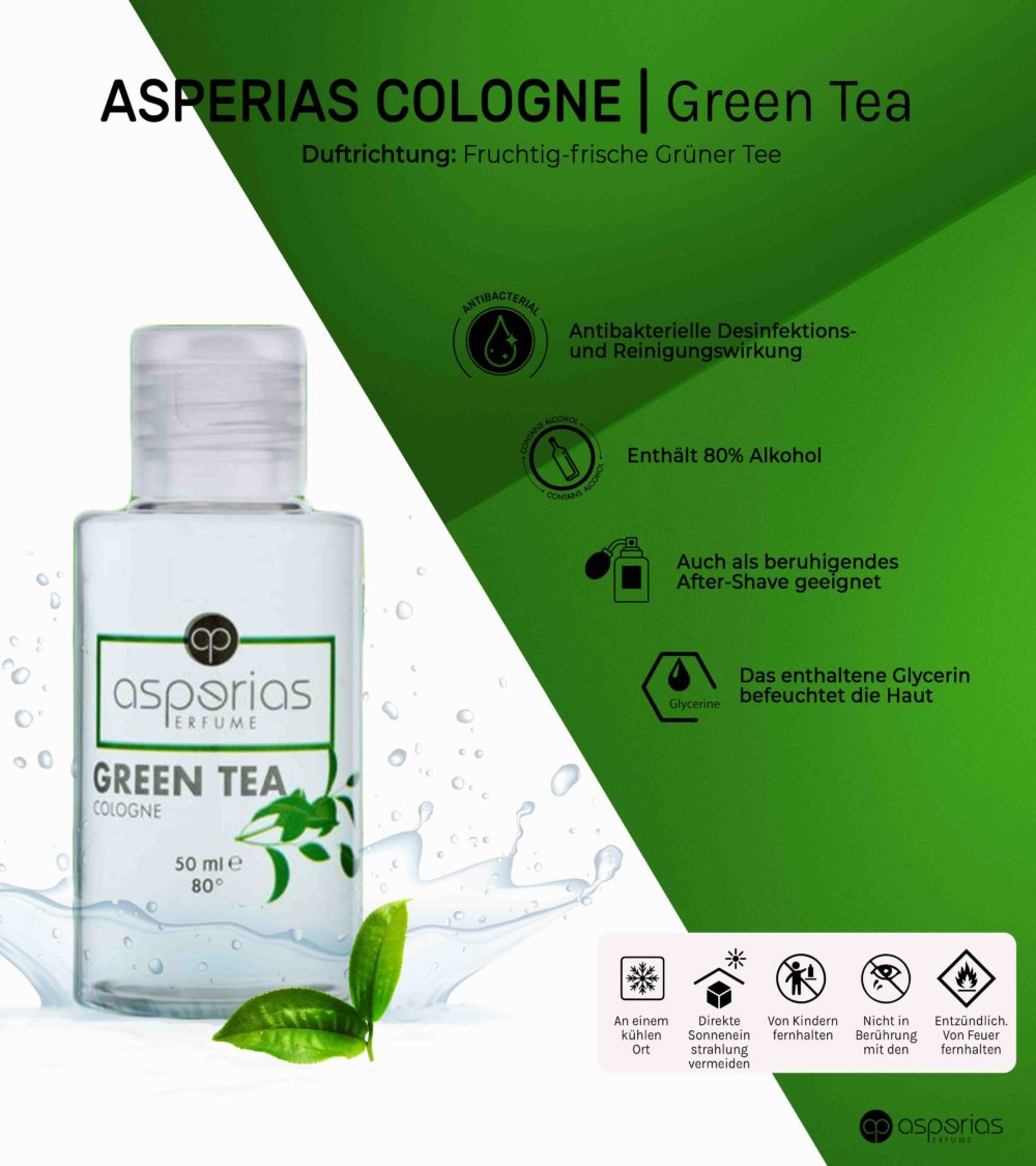 Lassen Sie sich entführen in die erfrischende Duftwelt eines erfrischenden Naturellen grün tee’s mit dem “Eau de Cologne” von “Asperias Parfum”, einem jungen und innovativen Unternehmen aus Berlin, das sich auf die Herstellung hochqualitativer Parfüms zu erschwinglichen Preisen spezialisiert hat. Das erfrischende Duftwasser belebt mit jedem wohlriechenden Tropfen Hände, Gesicht und Nacken. Durch den hohen Alkoholgehalt hat das “Cologne” auch einen hygienischen Nutzen und dämmt zuverlässig Viren und Bakterien ein. An warmen Sommertagen im Freien oder in geheizten, trockenen Innenräumen im Sommer sorgt das “Eau de Cologne” für die dringend benötigte Brise Erfrischung und Abkühlung. Das aufmunternde Duftwasser eignet sich auch hervorragend als After-Shave, das Rötungen, Hautirritationen oder Rasierpickel effektiv bekämpft oder als bewährtes Hilfsmittel gegen hartnäckige Pickel.